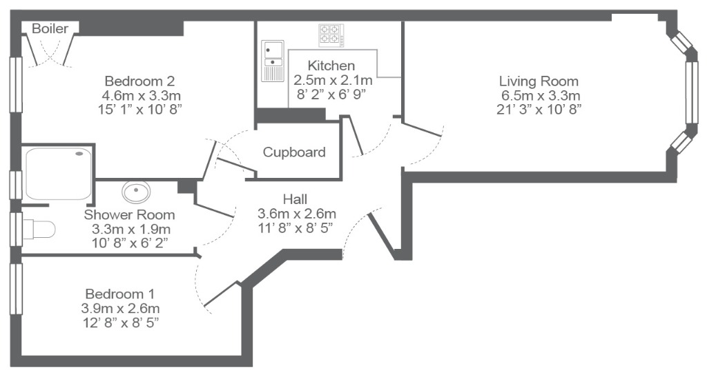 Accessed via a secure entry system, the flat opens into a generous entrance hallway which gives access to all rooms. The bright and spacious lounge boasts a stunning feature bay window, allowing natural light to flood the space whilst also having a feature fireplace. The internal modern fitted kitchen comes equipped with all essential white goods including, fridge freezer, washing machine, dishwasher, microwave, gas hob and electric oven. There are two double bedrooms, both with brand new carpets and the larger bedroom has a handy storage cupboard off. Completing the accommodation is the shower room which has white ceramics and a walk-in shower enclosure with electric shower.